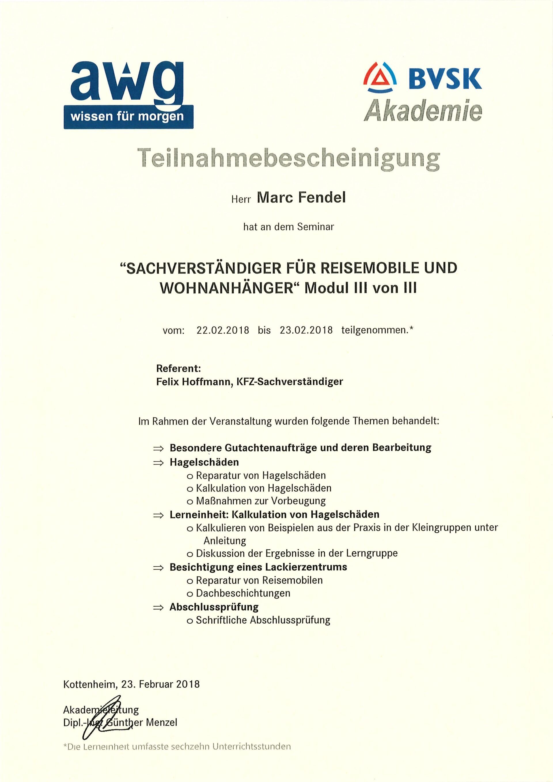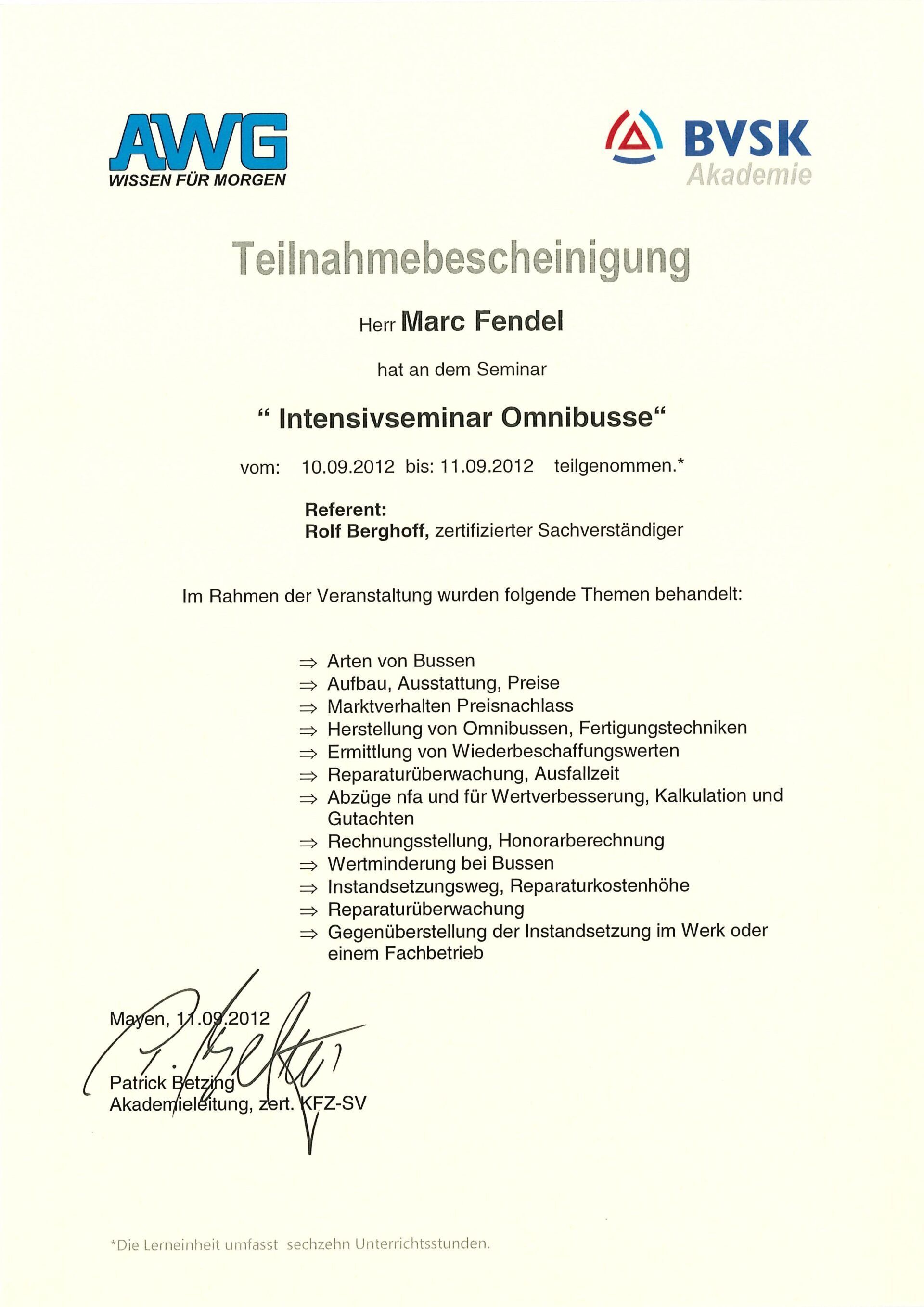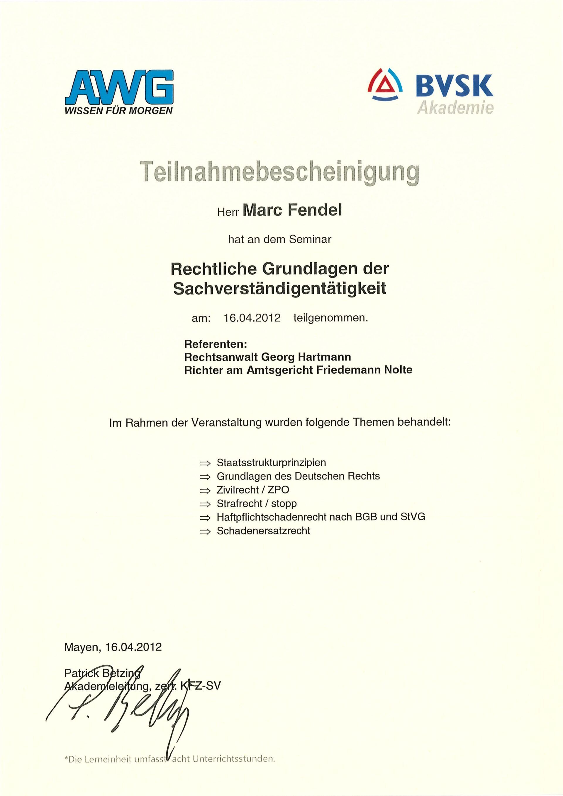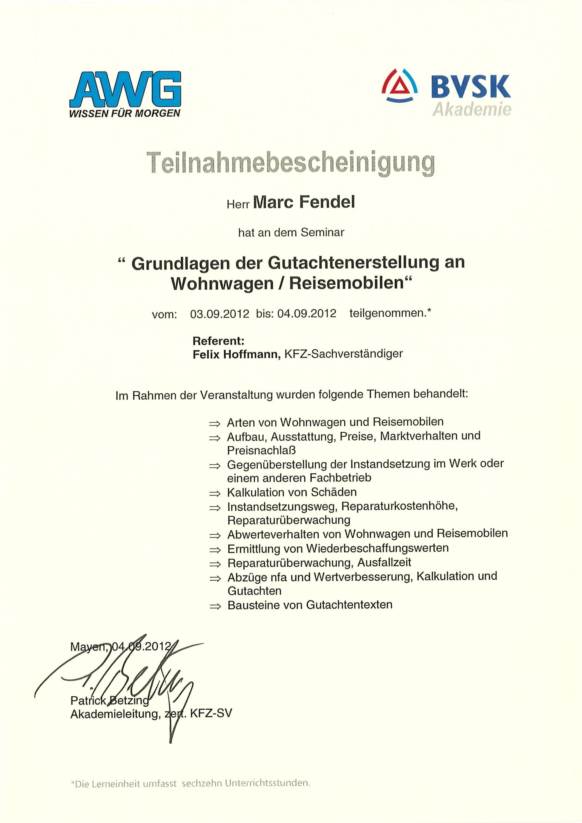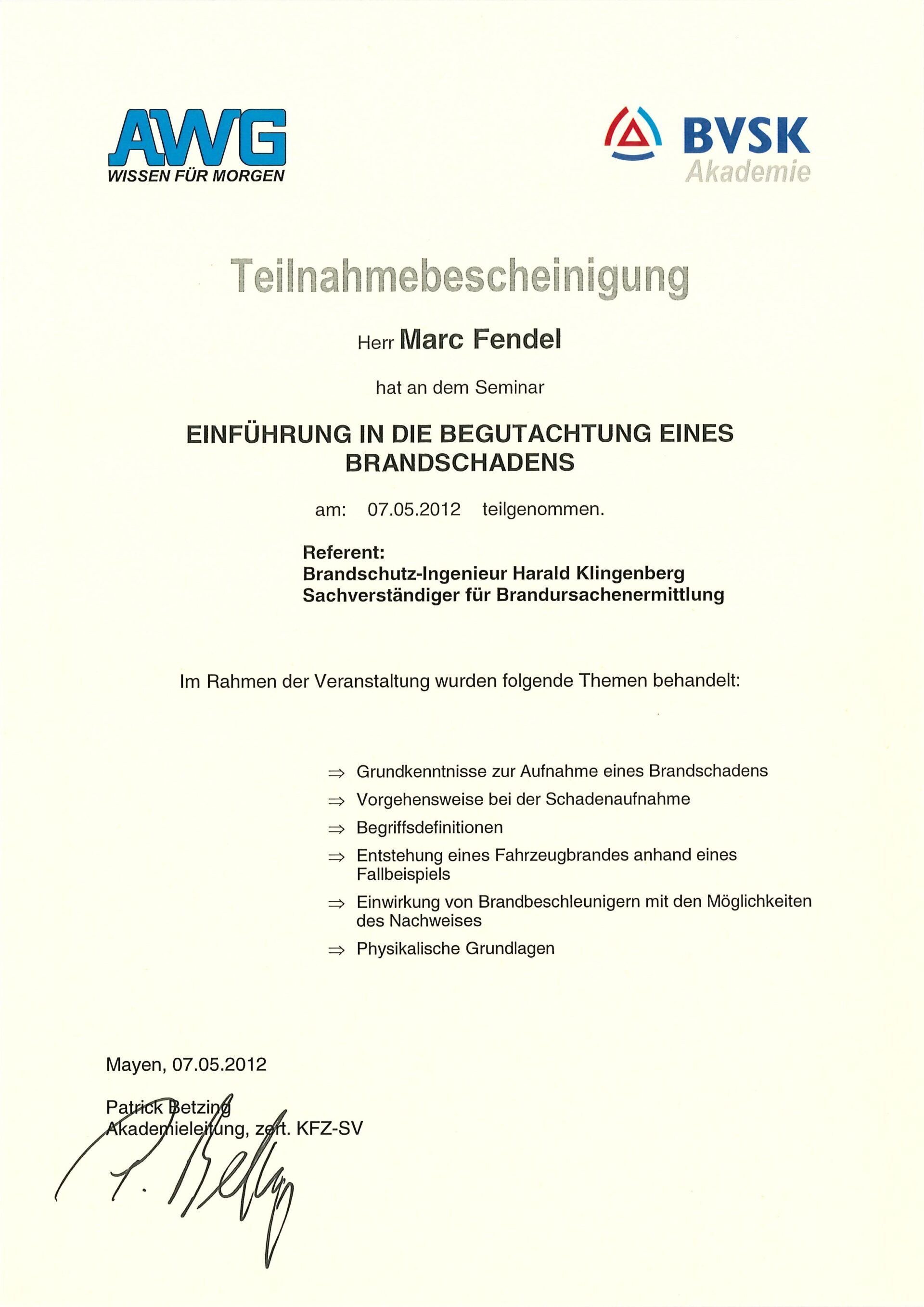 Ein Jahr später schloss sich eine zusätzliche Ausbildung über ein halbes Jahr in Vollzeit bei der offiziellen Akademie des BVSK (Aus- und Weiterbildungsgesellschaft in Kottenheim/Mayen) an. Anschließend war ich als freier Sachverständiger im Angestelltenverhältnis tätig.